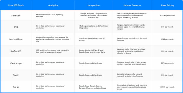 You may be wondering which optimization tools are best suited for your workflow. Some tools are weighted toward SEO and keyword research, while others are strong in AI content generation. We’ve evaluated some of the most popular tools on the market to give you a sense of the functionalities available: