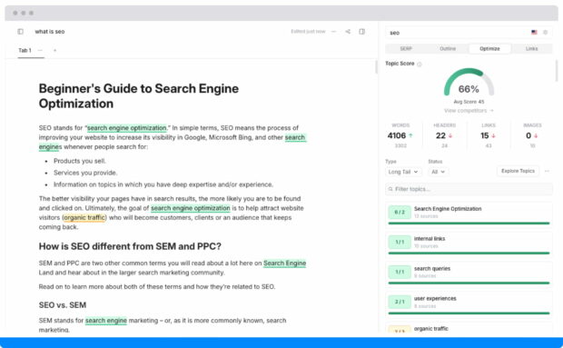 Topic also prioritizes user intent throughout the content optimization process, ensuring your content aligns with audience needs. For example, if someone searches for “jaguar,” do they want to know about the animal or car? By analyzing what searchers want from a particular keyword, Topic helps you create a more satisfying user experience.