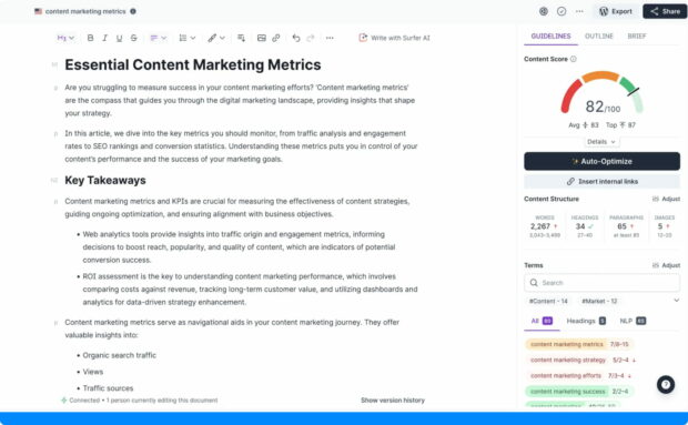 When you’re ready to publish, Surfer’s verification tools provide a final quality check and scans for plagiarism. If necessary, you can revert to previous drafts using version histories, which helps larger teams collaborate more effectively.