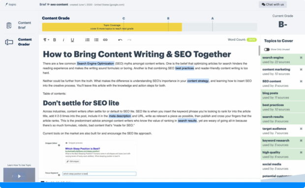 - Research Consolidation: Starting with a focus keyword, Topic scours three pages of Google search results to help you determine what to cover in your content. It suggests relevant headings, valuable questions, and additional keywords to ensure your content surpasses the competition.