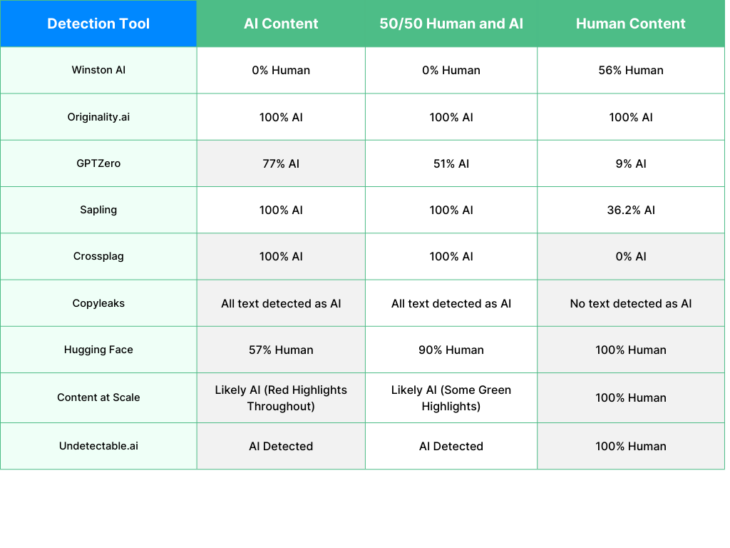 So, where should you start if you need to check the credibility of AI detectors? We think by testing them. We compared 100% human content, 100% AI content, and a mix of human and AI content across multiple AI detectors to evaluate how each one reacts — then we took a closer look at five of the most popular tools.
