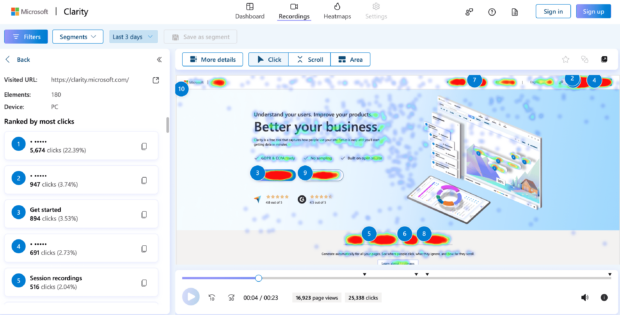 Clarity’s session recordings let you watch anonymized recordings to see how users navigate your web pages and when they abandon them. You can also detect issues, such as rage clicks — elements they try to click that aren’t links — and page errors. In addition to individual recordings, you can view a heat map aggregation.