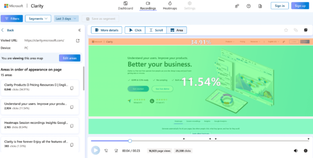 Your website metrics reflect how well you’re attracting traffic and the URLs your audiences are visiting, but what do users do when they’re actually on a page? Clarity uses advanced heat maps and session recordings to reveal how audiences interact with content on a page level. You can see where they click, how far they scroll before abandoning a page, and whether they click to another page but quickly return to the one they’re on. Best of all, Clarity is free.