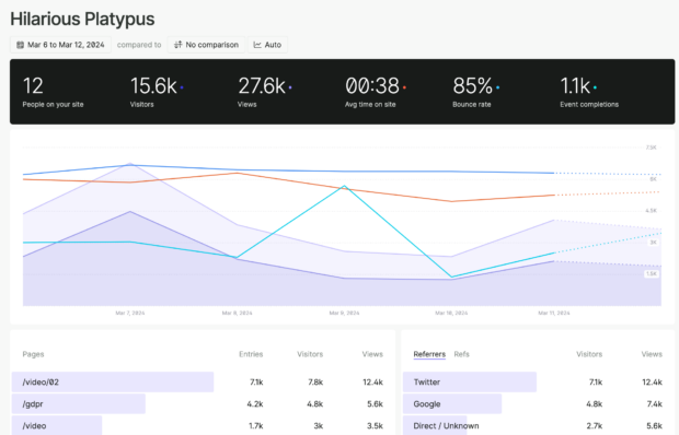 Simple Analytics is also a privacy-first content analytics platform that doesn’t store personal data, which means you don’t need cookie banners on your site. Its lightweight script minimizes impact on your site speed. Because the tool doesn’t collect data, it doesn’t use machine learning or predictive analytics.