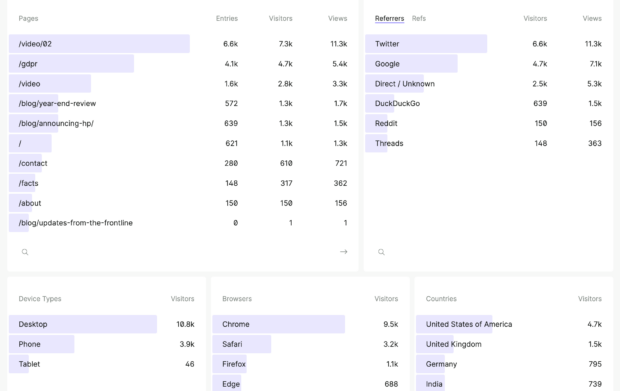 Like its name implies, Simple Analytics gets right to the point. Its straightforward user interface presents key metrics clearly. You can quickly monitor traffic, where your visitors come from, and the content they engage with.