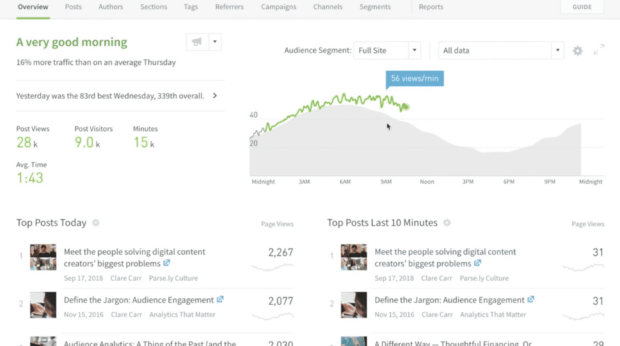 Parse.ly analyzes website metrics from the perspective of content performance, making it an ideal tool for content marketers and media sites. The tool tracks user engagement with content in a variety of ways, including by topic, section, author, campaign, channel, and publication date. As a bonus, it also promotes itself as an analytics platform that doesn’t require a data analyst to use. The easy-to-use platform allows you to focus your energies on your content strategy.