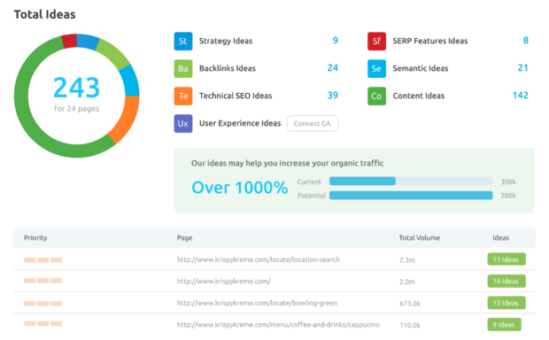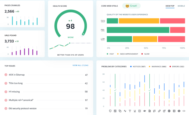 Semrush’s On-Page SEO tracker analyzes your content and provides concrete ideas to improve organic traffic. The suggestions relate to content readability and helpfulness, as well as SEO factors, such as backlinks, technical issues, and user experience.