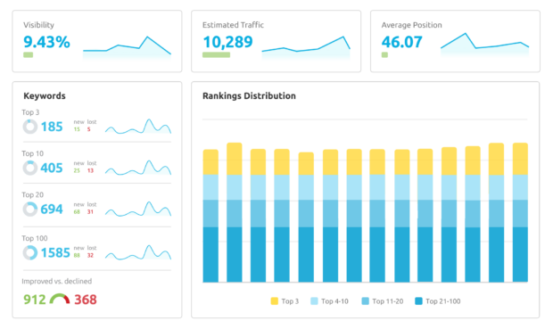 - Data on organic traffic, keyword rankings, backlinks, and social media engagement