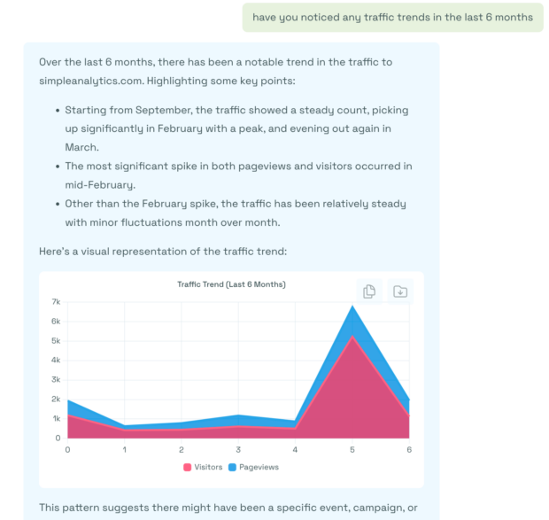 The tool’s AI chat helps you access your data more easily. Instead of trying to read reports and charts, for example, you can ask analytics questions in real time. For example, you can prompt the AI tool to compare traffic for different time periods or create a pie chart breaking down referral sources. The AI chat can also answer questions about using the tool’s features, which may be easier than searching the documentation.