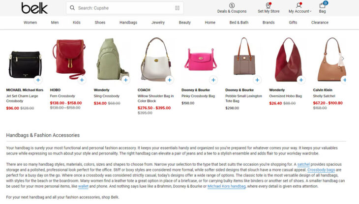 For example, a category about women’s purses might explain different types of bags, what to look for in a bag, what materials are used, etc. Here’s a category page for women’s purses from Simon’s that helps shoppers narrow down their purchase decision: